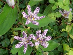 ホトトギス(杜鵑草) ユリ科 ホトトギス属 【花言葉】 「秘めた思い」 「永遠にあなたのもの」 名の由来は 若葉や花にある斑点模様が鳥のホトトギスの 胸にある模様と似ていることから。 お義母さんちの庭、日陰の部分でひっそりと咲いてるのを撮影。