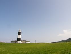 青空の下に見える灯台の存在と、広がる緑の世界。